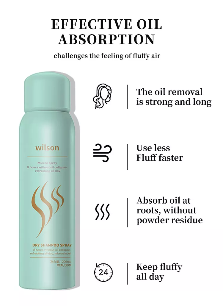 Прохолодний сухий шампунь Wilson Instant без змивання врятував багатьох жирних головок тимчасово вийти не можна помити проблему волосся, основною сировиною є рисовий крохмаль, крохмаль має пористу структуру, адсорбційну здатність, є звичайною гігроскопічною адсорбційною сировиною, може ефективно поглинати надлишок жиру на шкірі голови та очищати волосся від бруду, спрей і додайте деякі поверхнево-активні та електростатичні компоненти для полегшення видалення продуктів з волосся. Відчуйте свіжість і природність після використання.
