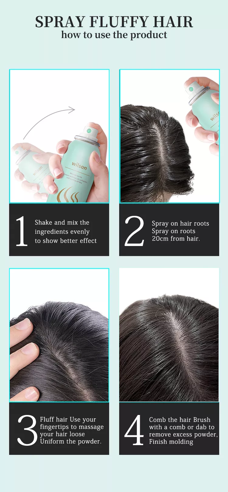 Прохолодний сухий шампунь Wilson Instant без змивання додаючи гліцерин, тригліцерид, вітамін Е, вітамін В5 та інші інгредієнти для догляду за волоссям, щоб забезпечити живлення та зволоження волосся, заповнити нестачу інгредієнтів у лупі та самому волоссі, доповнюючи масляний шар волосся, відновлюючи пошкоджене волосся, захищаючи голову від зовнішнього середовища та, нарешті, досягаючи мети відновлення здорового волосся.